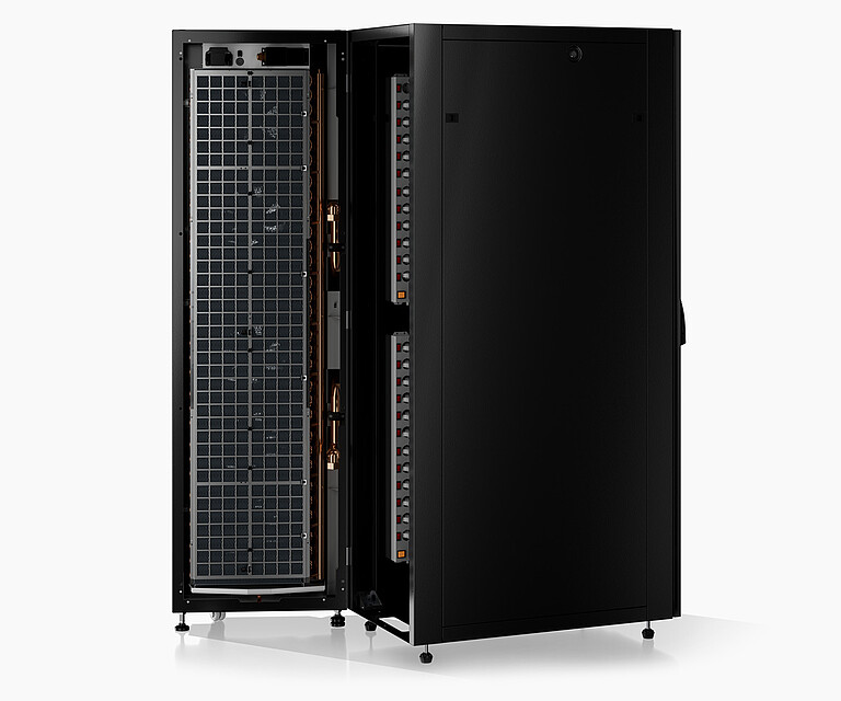 The rear door of the server rack is replaced by the CyberRack Active Rear Door. With the aid of the integrated heat exchanger, the unit cools your servers right there where the heat is produced, without discharging return air into the room. The IT room therefore has no additional heat at all.